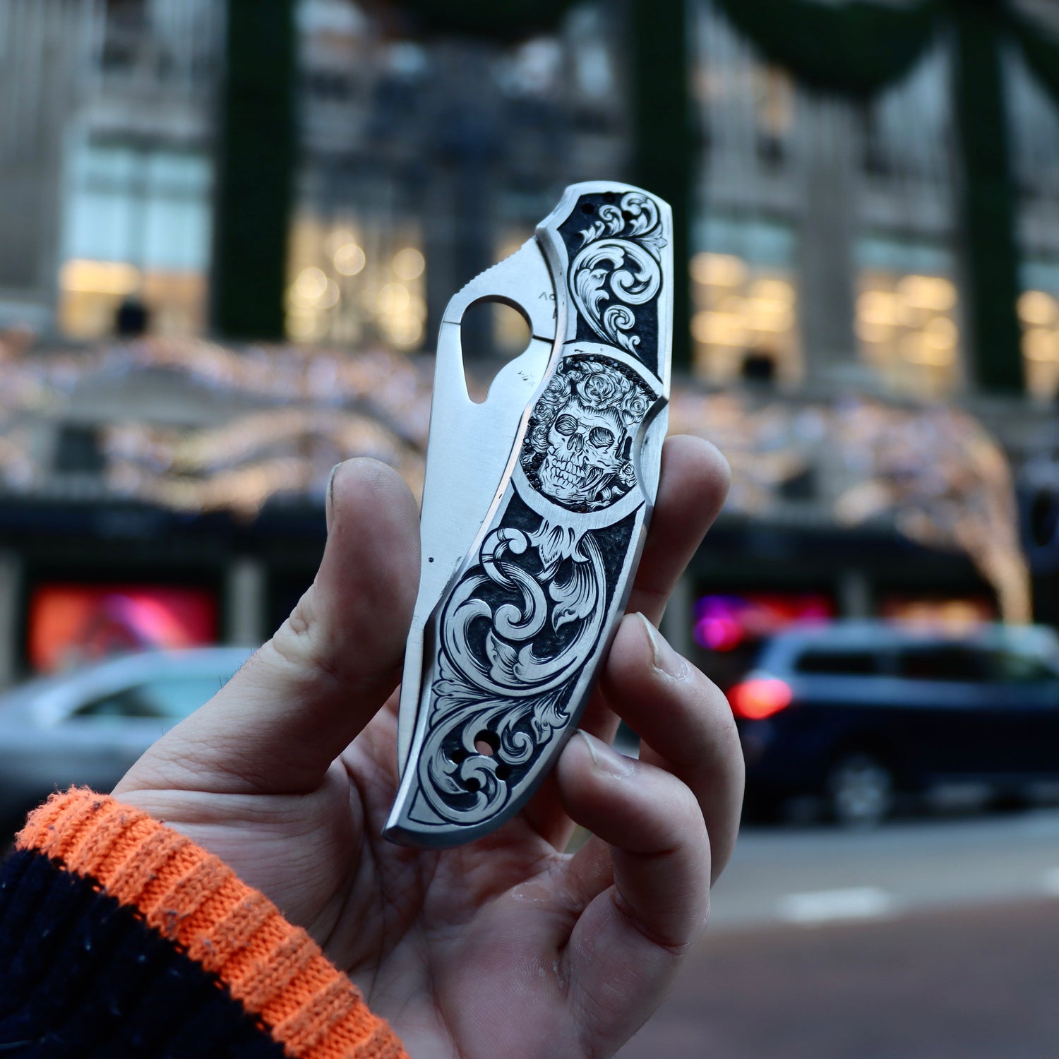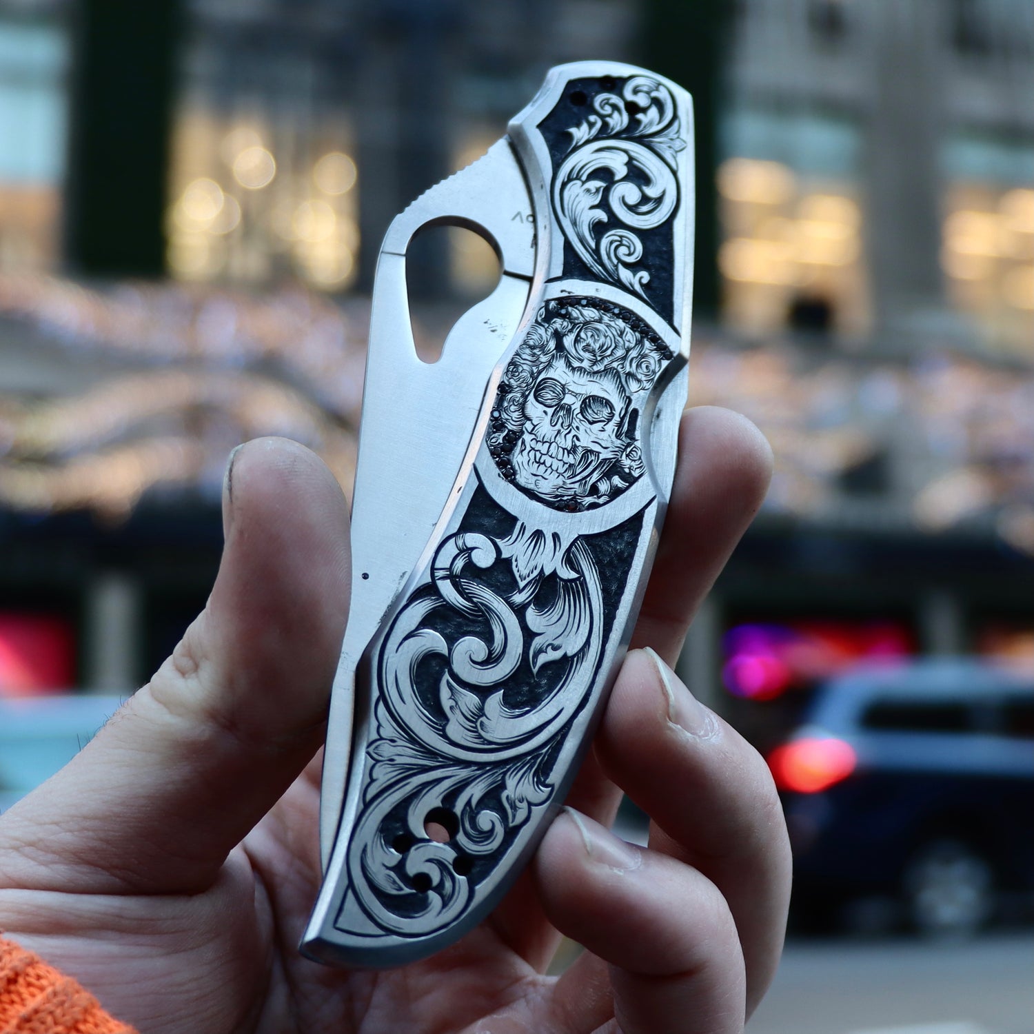 Hand engraved SpyderCo Byrd stainless steel pocket knife with red garnets pavé set around the skull focal point